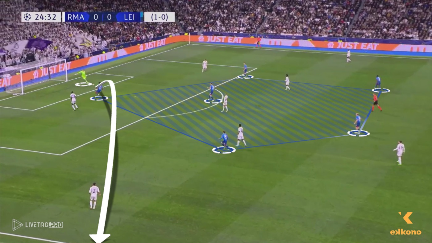 RBライプツィヒはレアル・マドリードに対してコンパクトなハイプレスブロックを維持し、中央のスペースを守りながら内側への侵入を防いでいます。